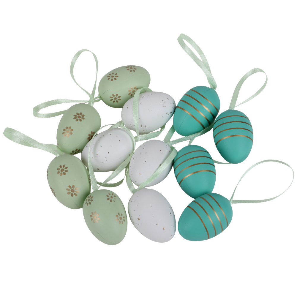 12 kleine Ostereier gemustert zum Aufhängen, Grün/Weiß Mix, 40 mm