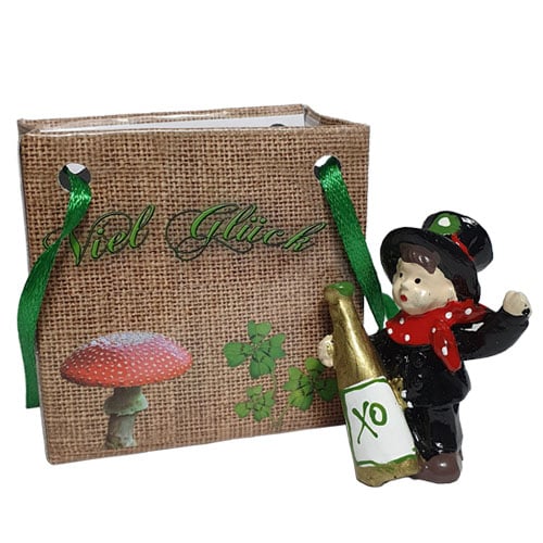 Gastgeschenk Silvester Schornsteinfeger mit Sektflasche, im Tütchen