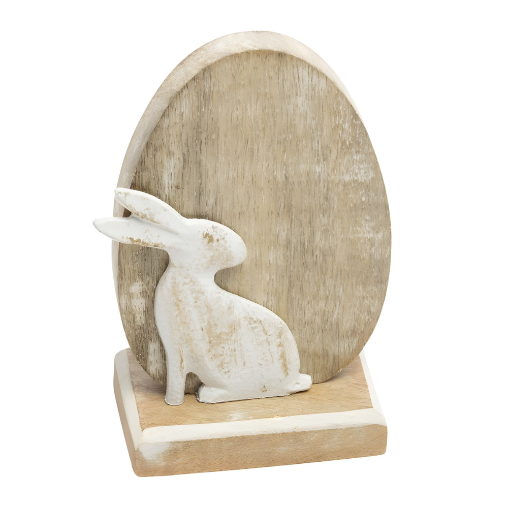 Mangoholz Osterei mit Hase, in Hellbraun/Weiß, 13,5 cm