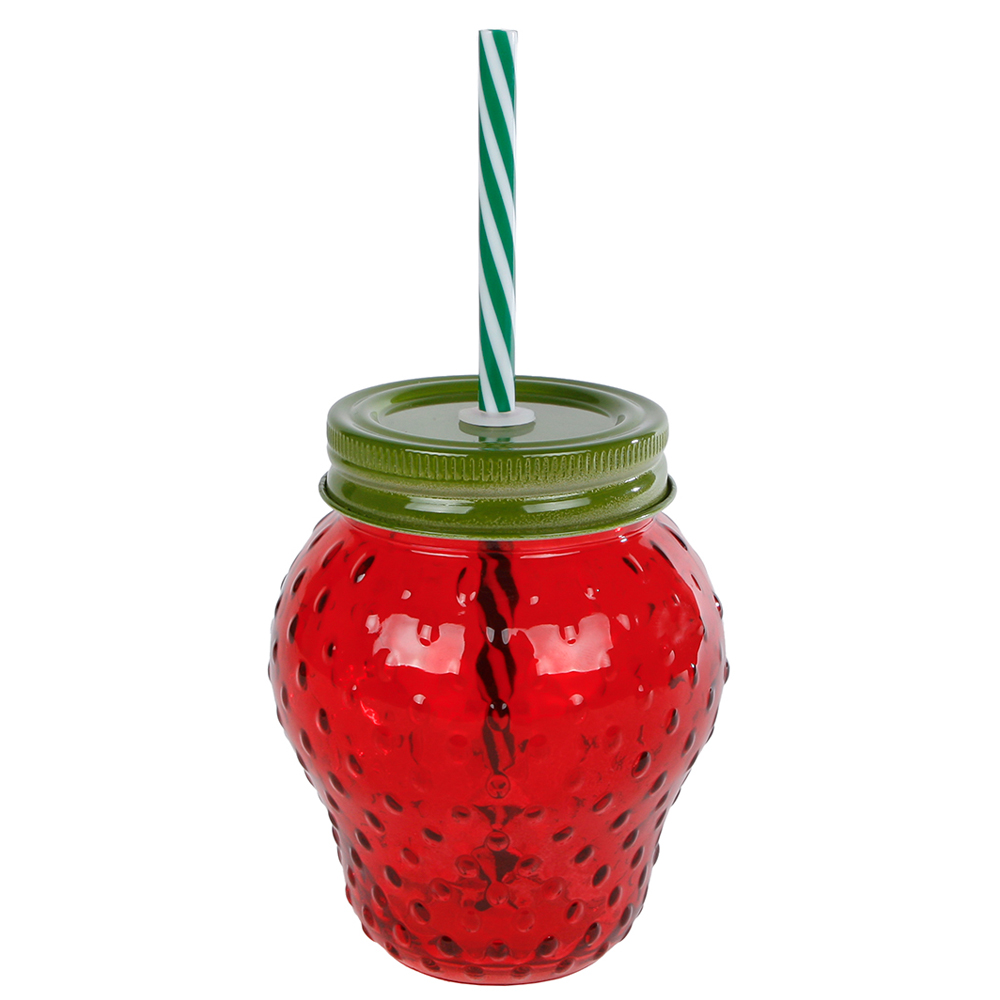 Sommer Glas mit Schraubdeckel und Trinkhalm in Erdbeer-Optik, 12,5 cm