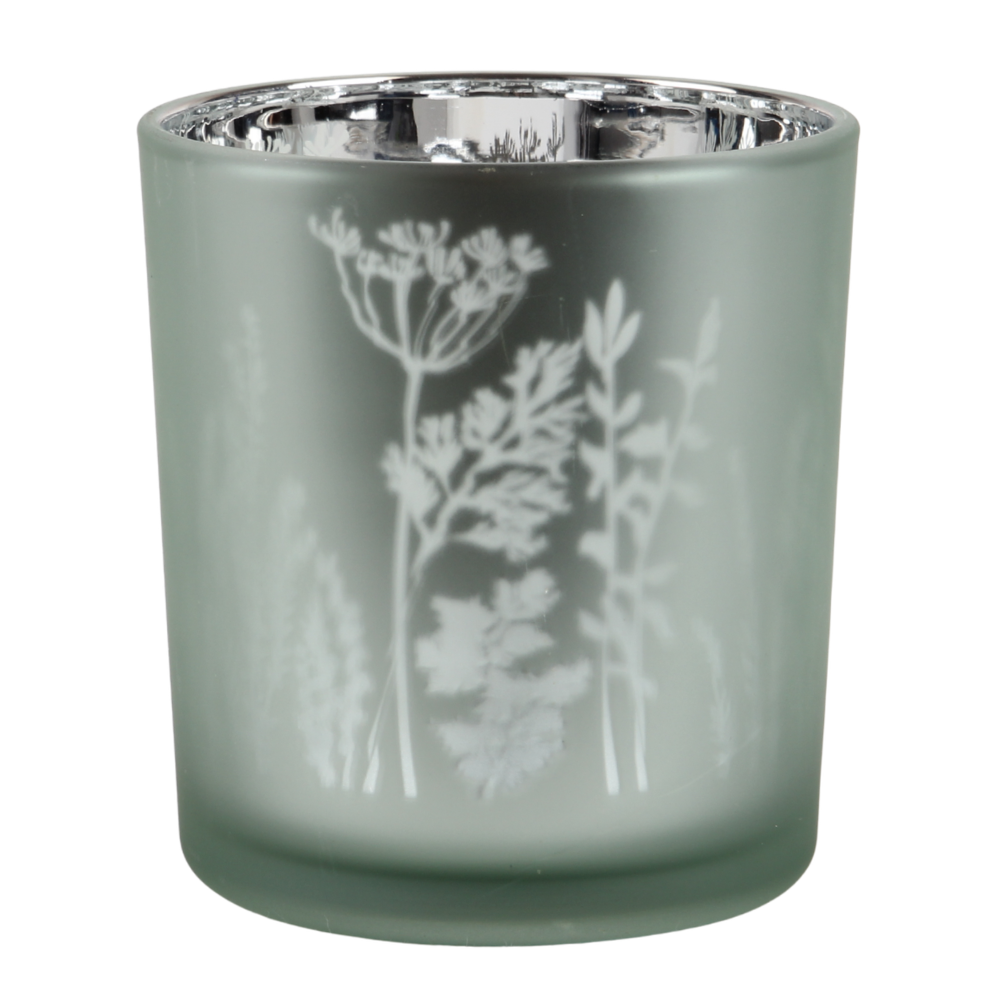 Teelichtglas Blumenwiese in Eukalyptusgrün hell, matt, verspiegelt, 80 mm