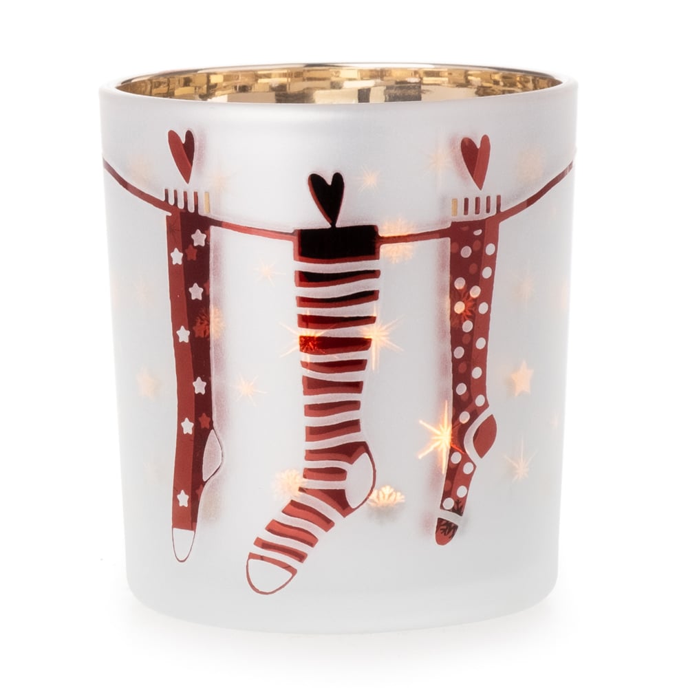 Teelichtglas Weihnachtsstrümpfe in Rot/Weiß, innen verspiegelt, 80 mm