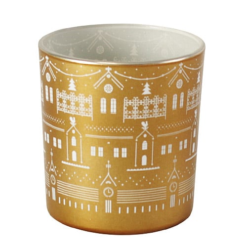 Teelichtglas Weihnachten, Winterdorf, Gold/Weiß, 80 mm