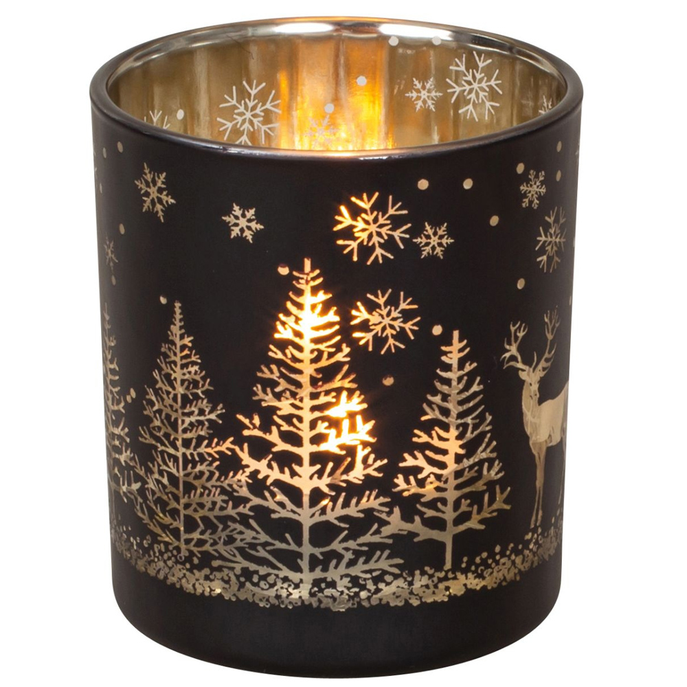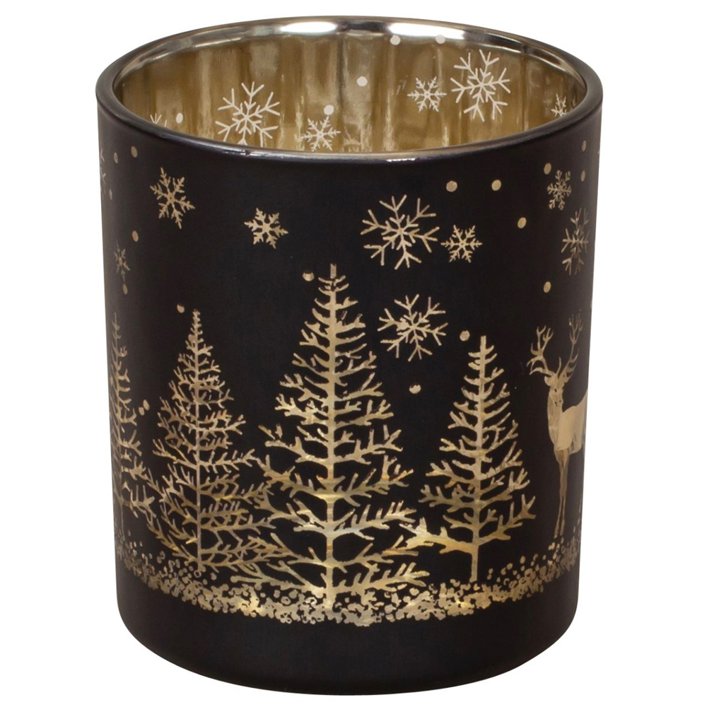Teelichtglas Winterwald mit Hirsch in Schwarz/Gold verspiegelt, 78 mm