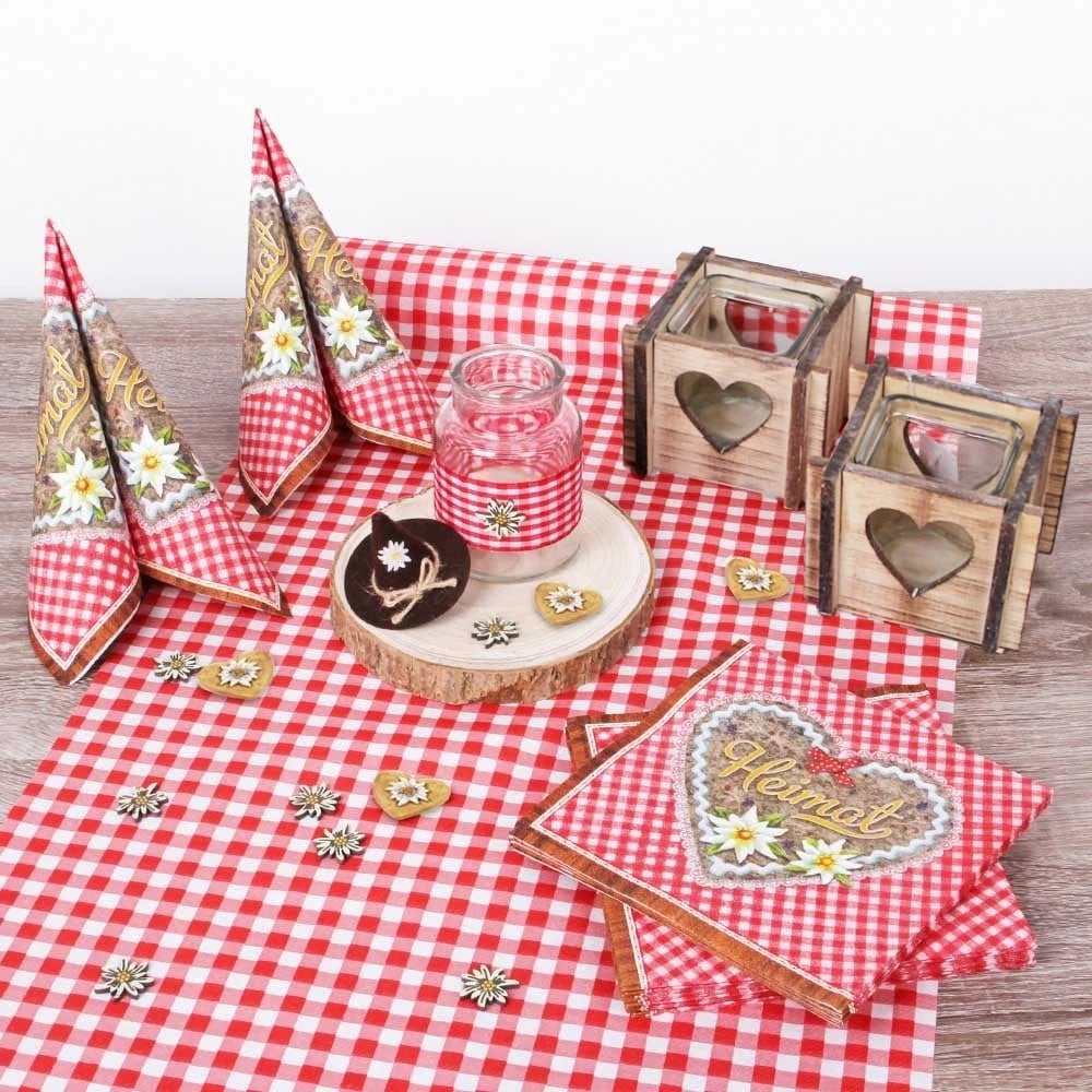 Die rot-weiß karierten Servietten mit Herz- und Edelweiß-Design bilden den Mittelpunkt und versprühen pure Gemütlichkeit. Passend dazu runden dekorative Accessoires wie kleine Herz- und Blumen-Streuteile sowie die rustikalen Holz-Windlichter das Bild ab. In Kombination mit dem karierten Tischläufer entsteht eine stimmige Tischdeko, die wie gemacht ist für Feste mit bayerischem Charme.