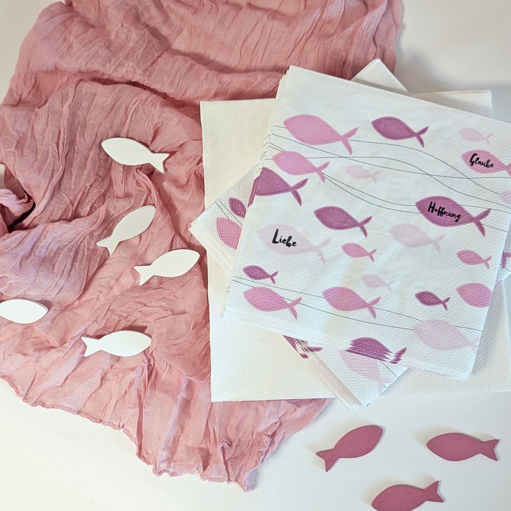Im Paket enthalten sind hochwertige große weiße Airlaid Servietten und chlorfrei gebleichte Lunch Servietten mit dem christlichen Symbol Fisch – stilvoll und passend zum Anlass, ein gekreppter Tischläufer in sanftem Rosé, der sich wunderschön über Ihre Festtafel legt und für eine festliche Basis sorgt, farblich passende Streudeko in Form von kleinen Fischen – ein liebevolles Detail, das Ihre Gäste begeistern wird, hochwertige Kerzen & Teelichthalter, die für eine stimmungsvolle Beleuchtung sorgen und den Tisch in ein sanftes Licht tauchen und ein Aufsteller für die Tischmitte aus Holz in Form eines Fisches.