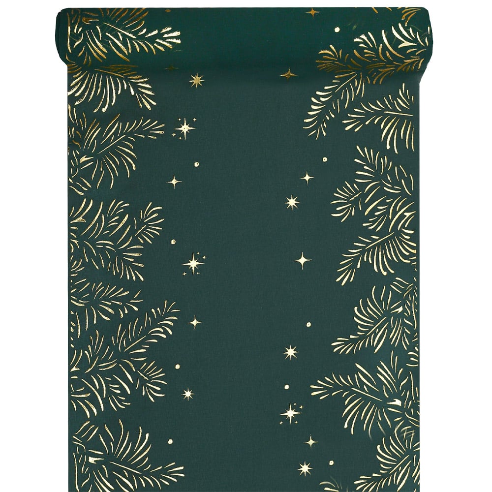 2,5 Meter Tischläufer hauchdünn, Weihnachten, Blätter in Tannengrün/Gold, 27 cm