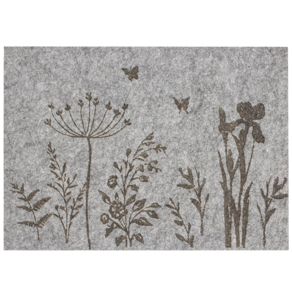 Bringen Sie die Ruhe und Schönheit einer blühenden Wiese direkt an Ihren Esstisch. Dieses Filz-Tischset in elegantem Grau ist weit mehr als nur ein praktischer Schutz für Ihre Möbel. Mit seinem detailreichen Aufdruck von filigranen Wildblumen, zarten Farnen und tanzenden Schmetterlingen verleiht es jeder Mahlzeit eine Prise Naturromantik. Das rechteckige Format von 40 x 30 cm bietet ausreichend Platz für Gedecke und sorgt durch die weiche, griffige Beschaffenheit des Materials für eine angenehme Akustik und wohlige Haptik während des Essens.